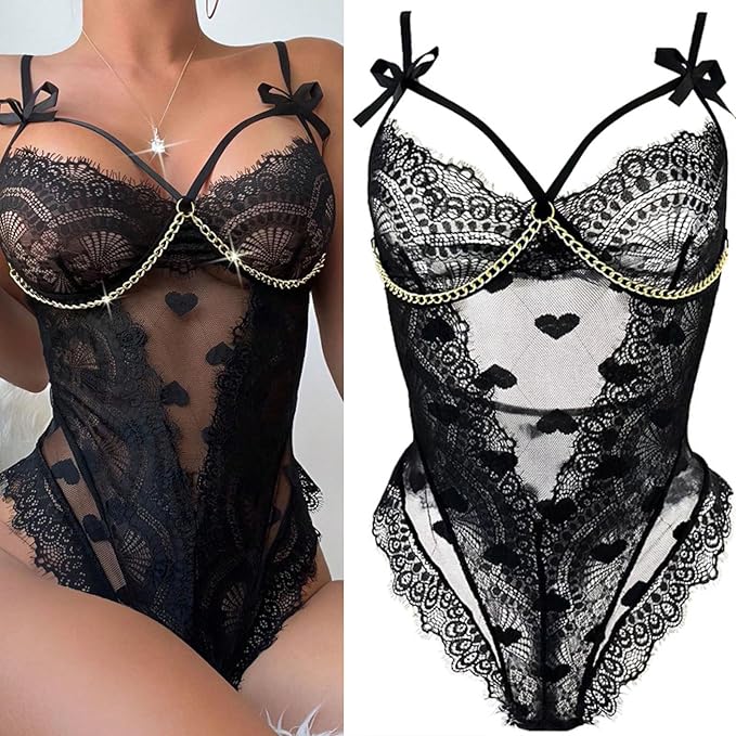 Detalii subtile: Lanturile metalice și funditele adaugă un element suplimentar de senzualitate și eleganță, completand designul rafinat al lenjeriei.